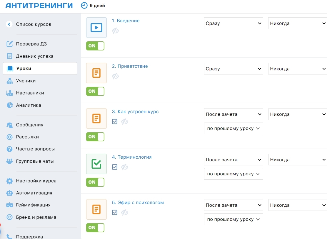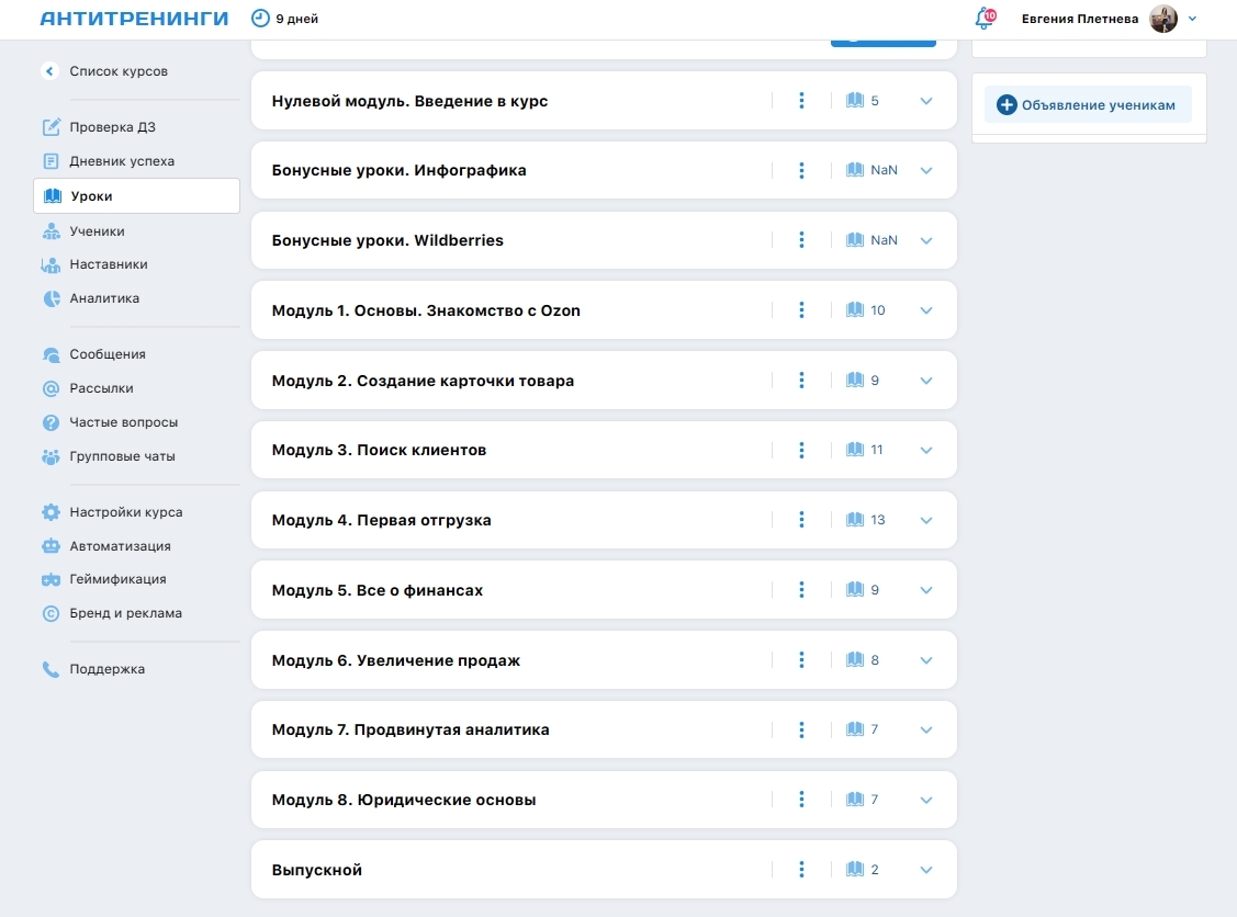 создала 12 модулей, в них 90 уроков разного типа: тесты, задания, теория