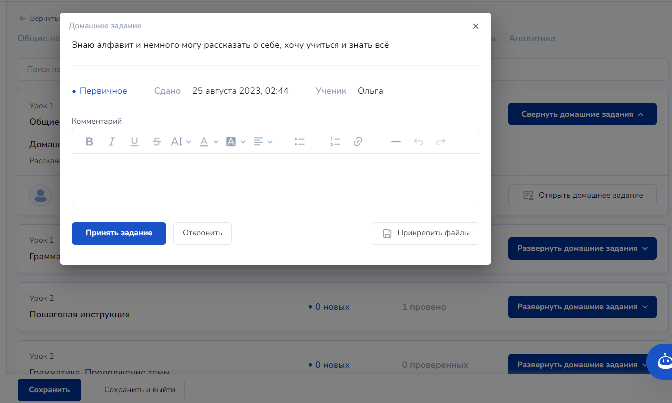 7.Показала как посмотреть аналитику по ученикам и домашним заданиям)
